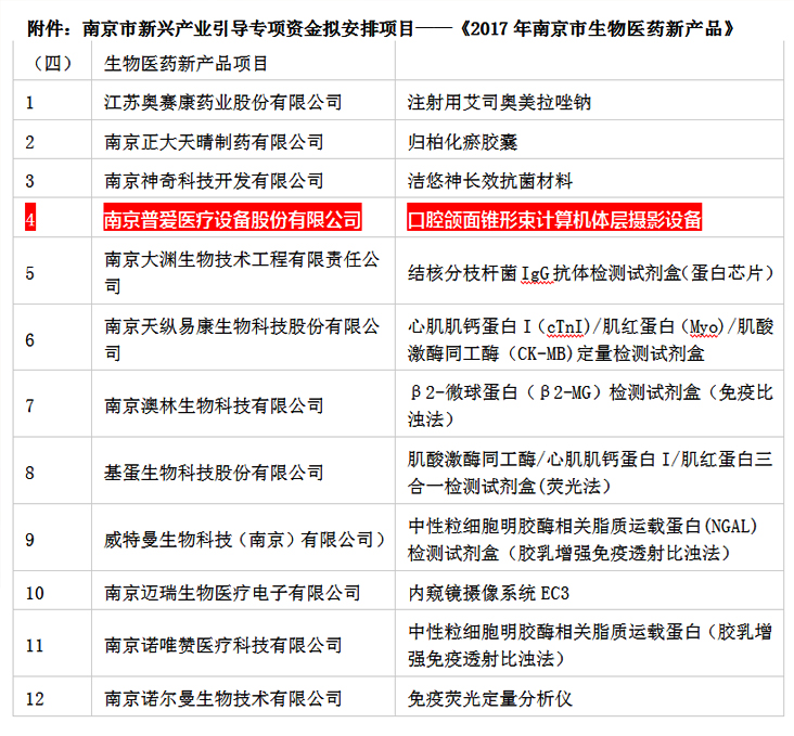 普愛(ài)醫(yī)療自主研發(fā)的重磅新品PLX3000A(口腔CBCT)成功入選《2017年南京市生物醫(yī)藥新產(chǎn)品項(xiàng)目》。這是普愛(ài)醫(yī)療繼2015年DR產(chǎn)品(PLX8500系列)、3D C形臂(PLX7200)、2016年動(dòng)態(tài)平板C形臂(PLX7100 A),連續(xù)三年4個(gè)產(chǎn)品入選南京市生物醫(yī)藥新產(chǎn)品項(xiàng)目。